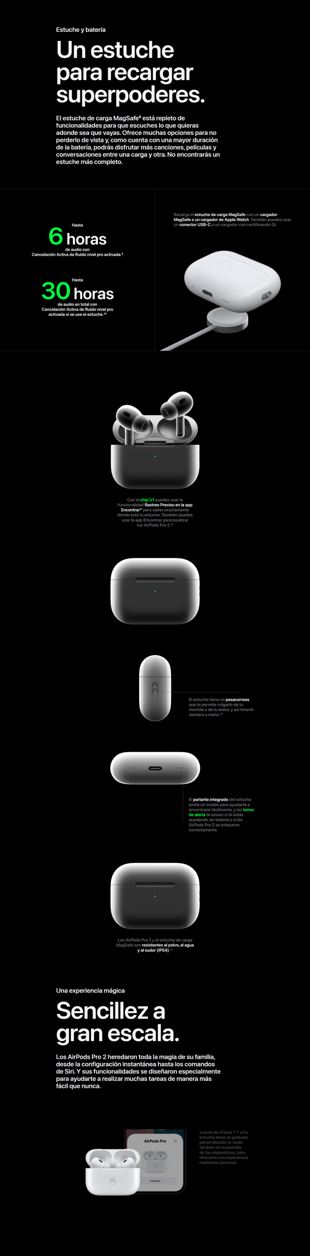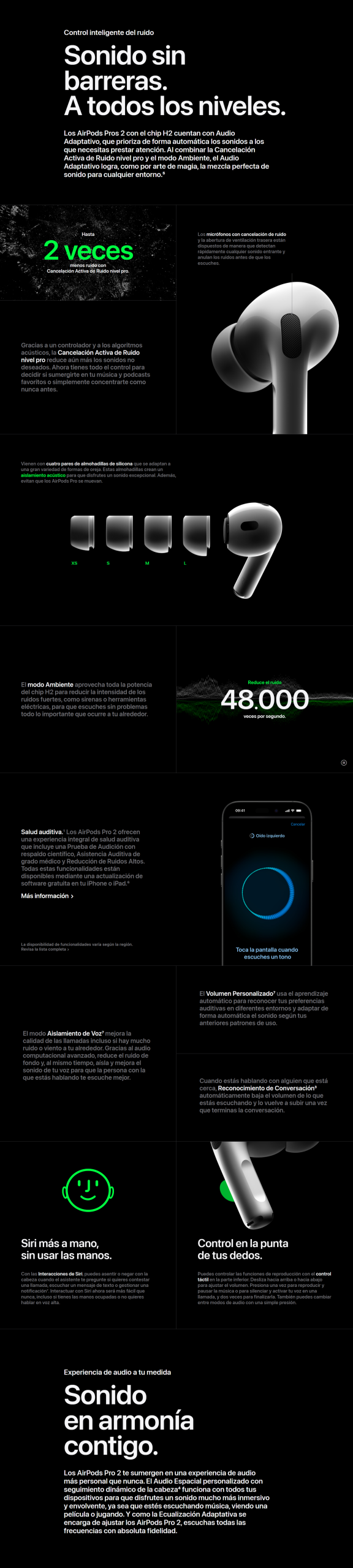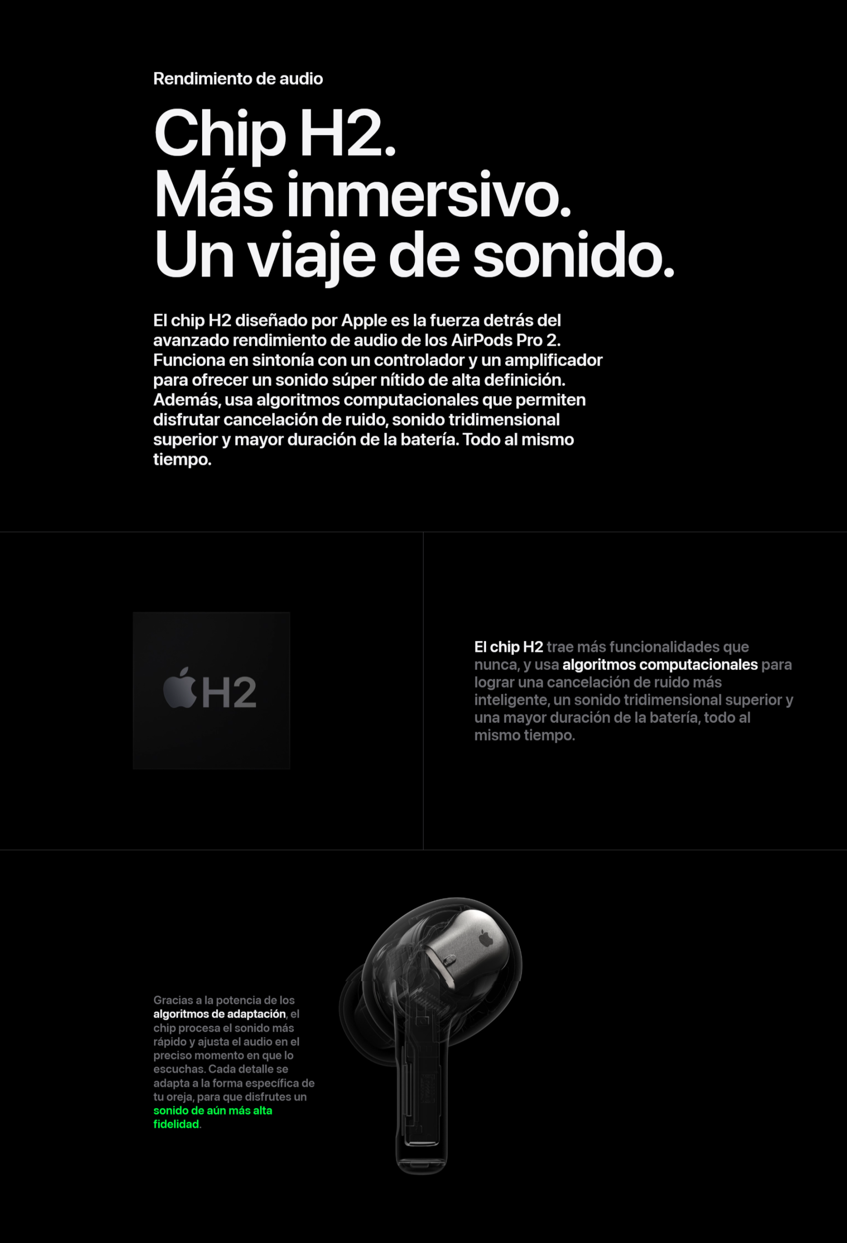 AirPods Pro 2. Con Cancelación Activa de Ruido nivel pro, Audio Adaptativo, modo Ambiente, Audio Espacial personalizado y una innovadora experiencia en salud auditiva: Prueba de Audición con respaldo científico, funcionalidad Asistencia Auditiva de grado médico y Reducción de Ruidos Altos.