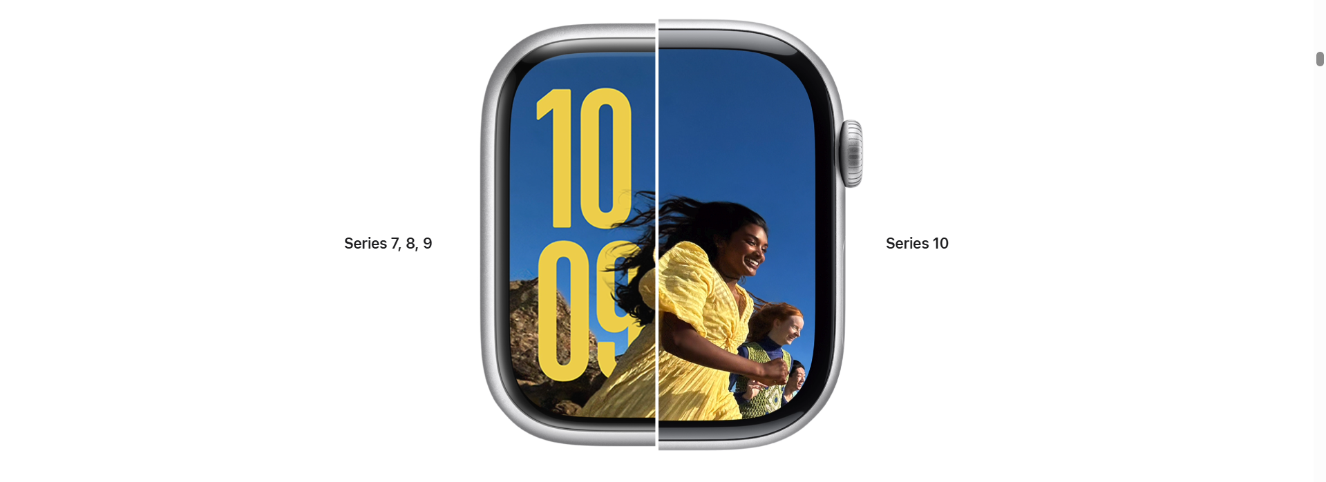 El Series 10 tiene un área de visualización más grande que la de cualquier otro Apple Watch: es hasta un 75% mayor que la del Series 3, hasta un 30% mayor que la del Series 4, 5, 6 y SE, y hasta un 9% mayor que la del Series 7, 8 y 9. Una diferencia de espacio enorme que te ayuda a ver y hacer mucho más.