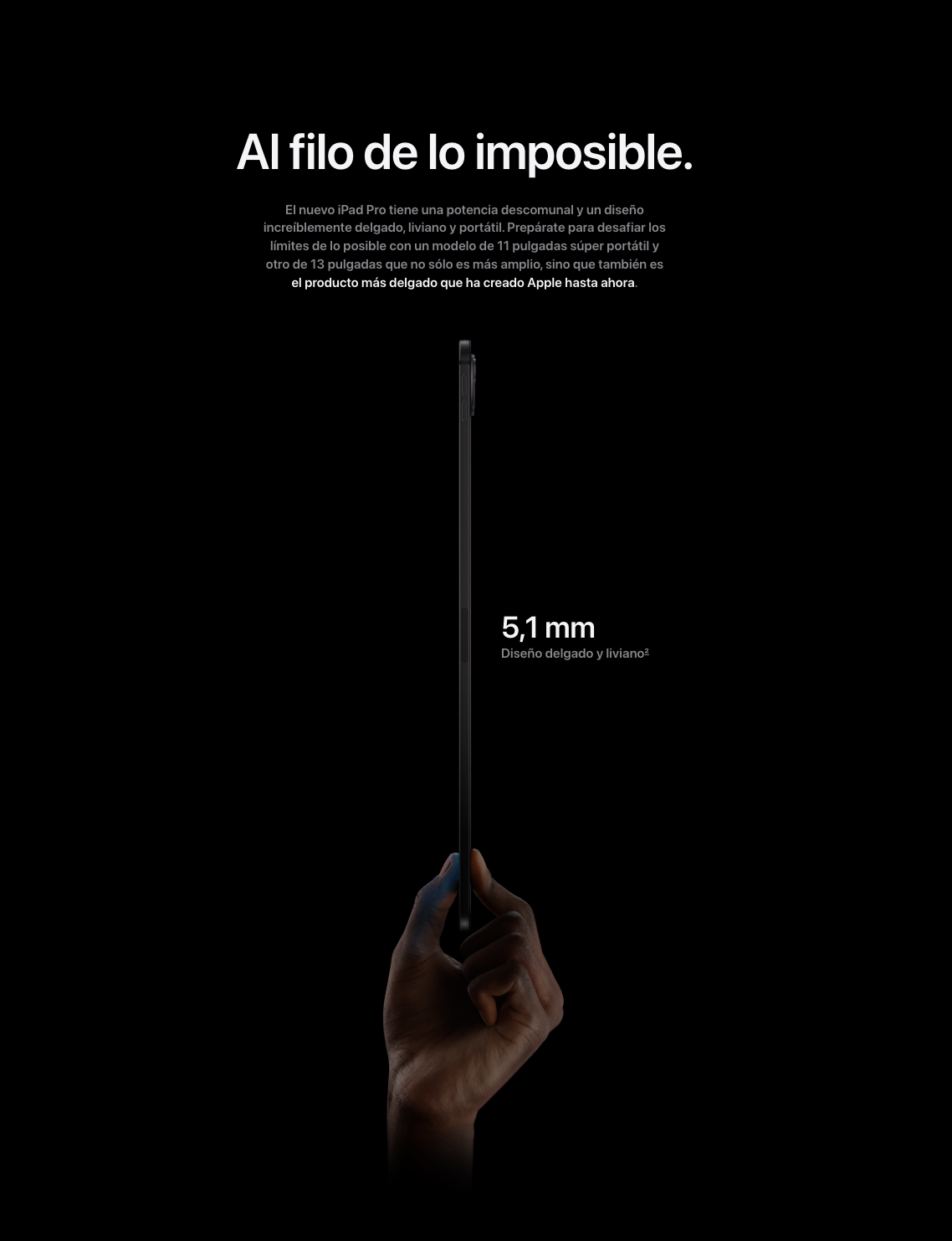 El nuevo iPad Pro es increíblemente delgado y viene con el descomunal rendimiento del chip M4 de Apple, una revolucionaria pantalla Ultra Retina XDR y conexiones Wi-Fi 6E y 5G ultra rápidas. Combínalo con el Apple Pencil Pro y el Magic Keyboard para multiplicar tus posibilidades a la hora de trabajar y crear.