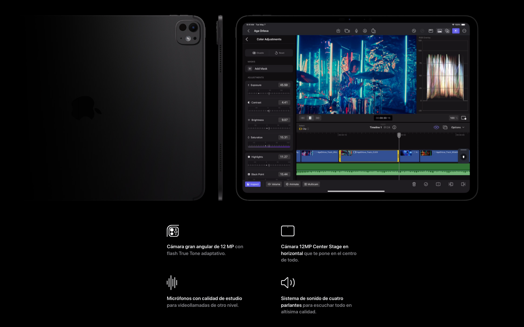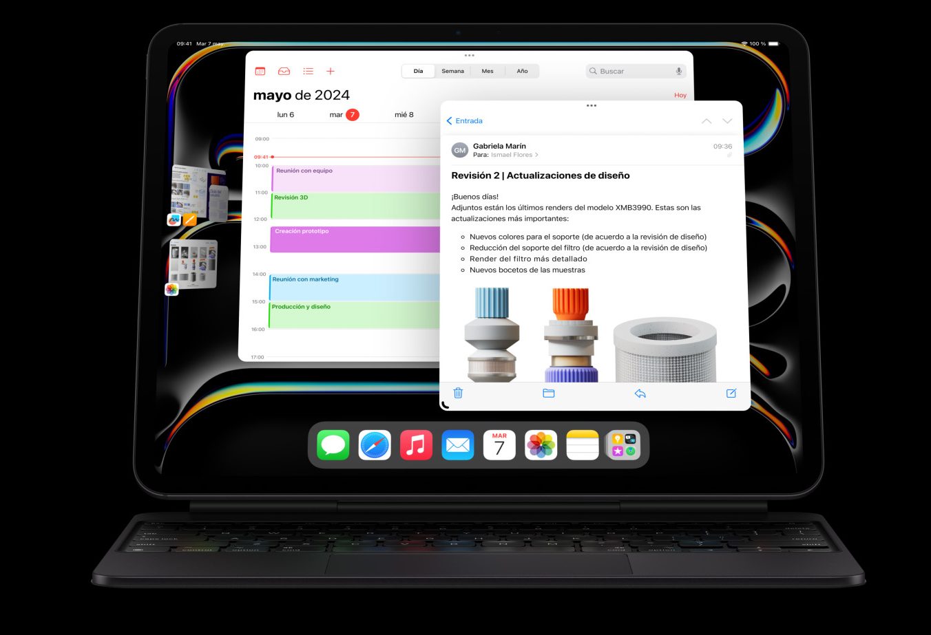 Presentamos el chip M4, la nueva generación de chips de Apple. Está diseñado para Apple Intelligence, que te ayuda a escribir, expresarte y hacer de todo con mucha facilidad en el iPad Pro. Además, es el responsable de ofrecer un rendimiento descomunal en un diseño increíblemente delgado y liviano. Un nuevo motor de visualización mejora increíblemente la precisión, el color y el brillo. La GPU le saca partido al trazado de rayos acelerado por hardware para llevar las gráficas a lo más alto. Y con el Neural Engine del chip M4, el iPad Pro está listo para desatar todo el potencial de la inteligencia artificial.