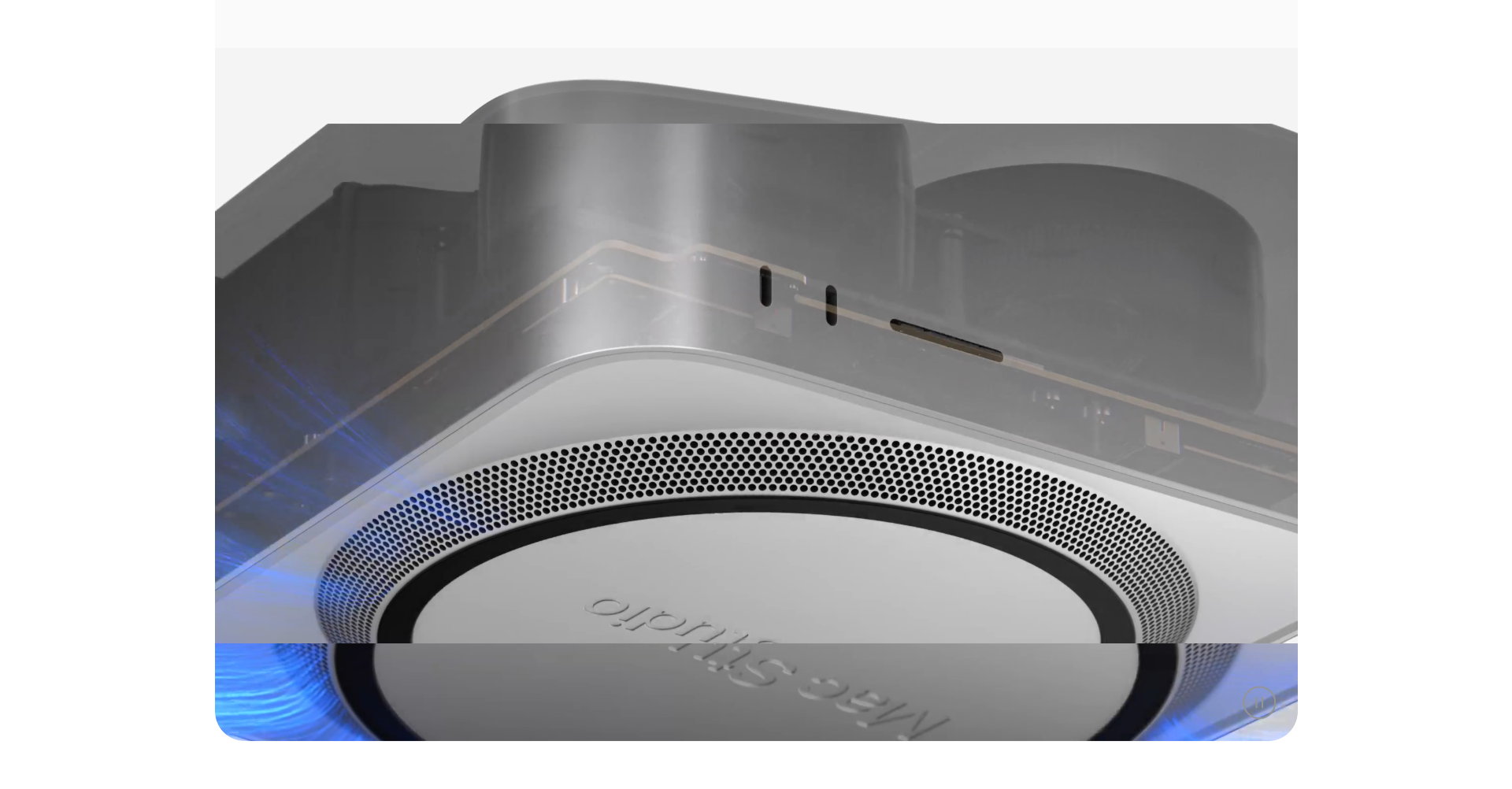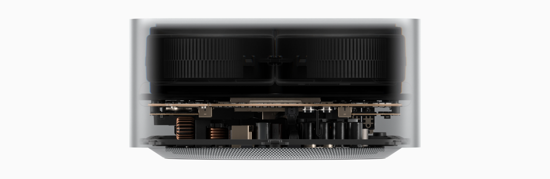 Dentro de su carcasa cuadrada de 19,7 centímetros se encuentra un sistema térmico diseñado para que los chips M4 Max y M3 Ultra procesen las tareas más exigentes a velocidades increíbles. Y aun siendo así de poderoso, el Mac Studio trabaja en silencio, por lo que nunca interfiere con tu trabajo.