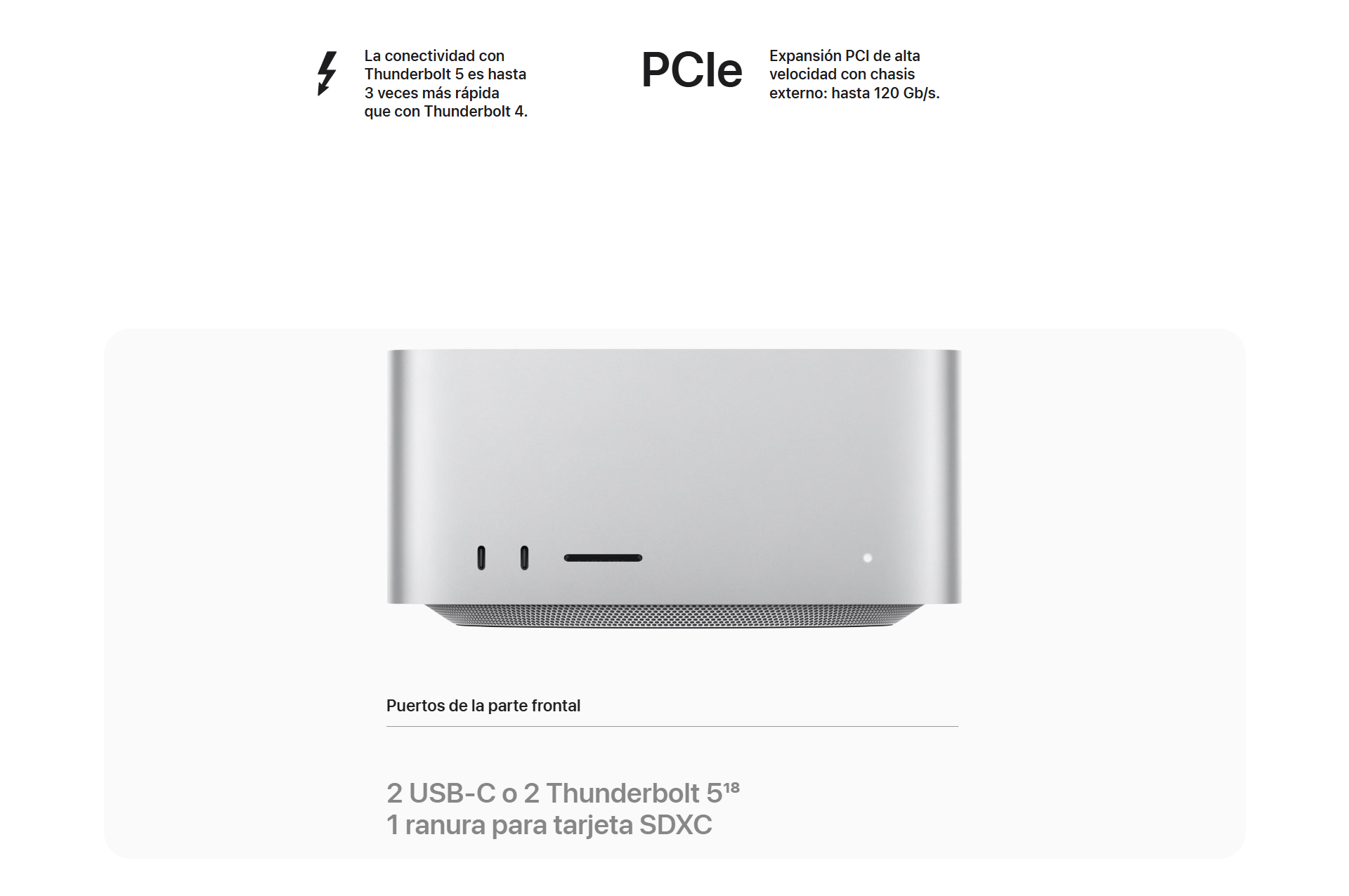 Crea el estudio de tus sueños con una versatilidad inigualable. El Mac Studio trae Thunderbolt 5, que permite velocidades de transferencia de hasta 120 Gb/s, es decir, tres veces más que con Thunderbolt 4, y es compatible con Wi-Fi 6E y Bluetooth 5.3. Agrega monitores externos, transfiere contenido directamente desde tarjetas SDXC, conecta periféricos de alta velocidad o usa un chasis externo de expansión PCIe para que tengas tu espacio creativo ideal.