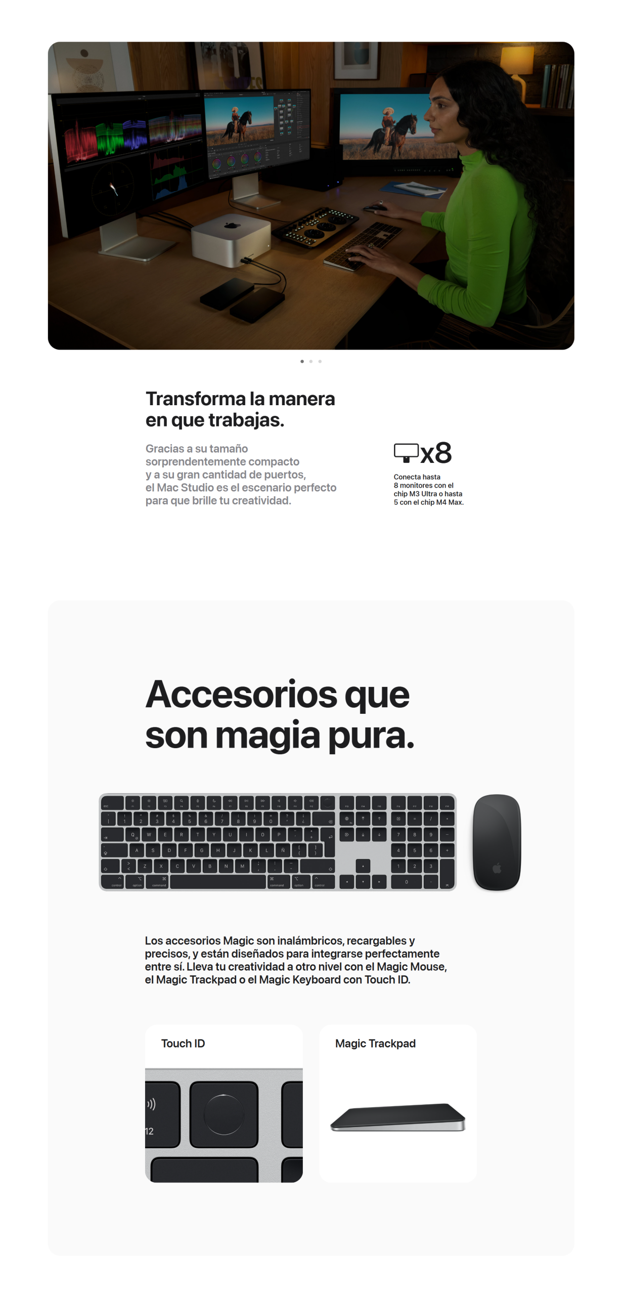 El Mac Studio es el computador de escritorio profesional en su máxima expresión. Viene con el asombroso chip M4 Max o el descomunal chip M3 Ultra y cuenta con una memoria increíble, gráficas de otro planeta, capacidades de IA de nivel superior y puertos Thunderbolt 5 ultra rápidos. Una potencia arrolladora en un diseño compacto y silencioso. Diseñado para Apple Intelligence.