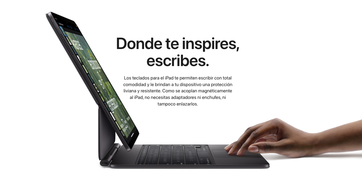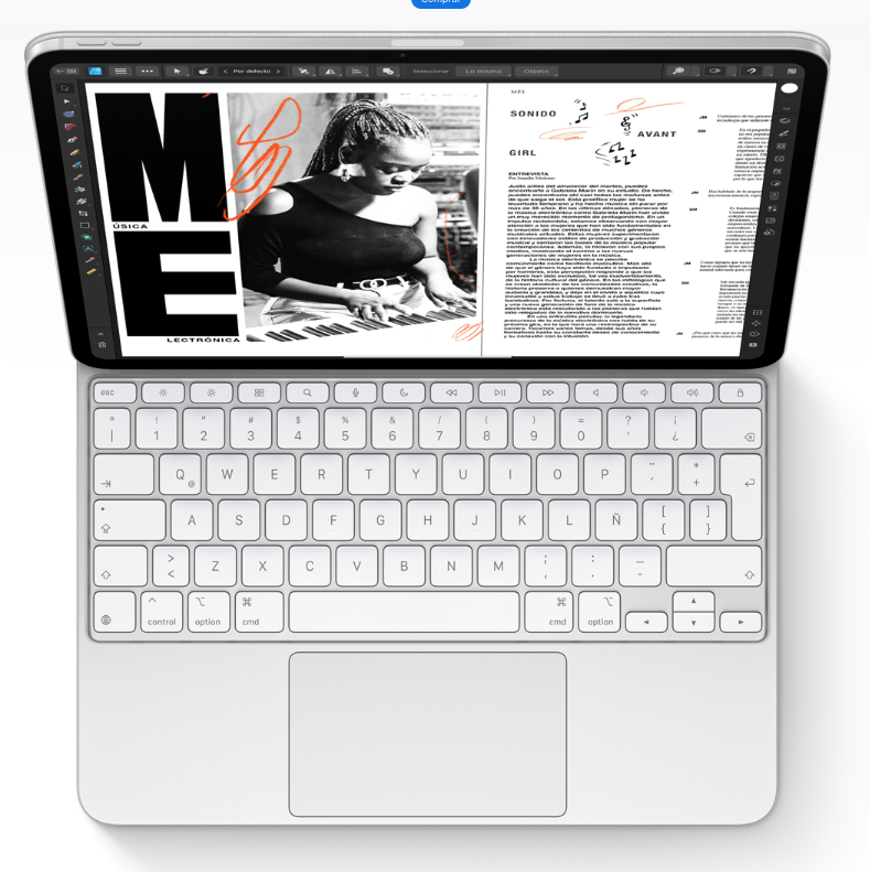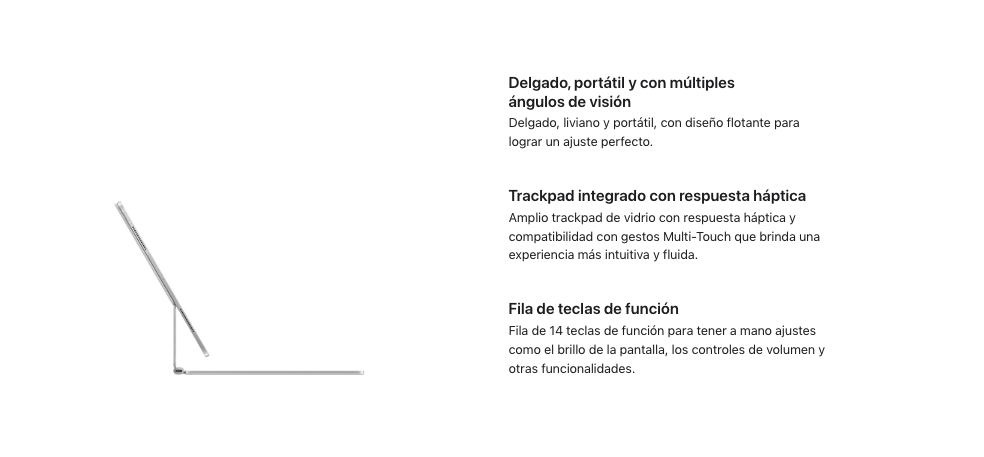 El Magic Keyboard para el iPad Pro tiene un elegante diseño portátil con trackpad y una estructura de aluminio donde puedes apoyar las manos para escribir con total comodidad. Incluye una fila de 14 teclas de función, viene con entrada USB-C para cargar tu iPad y además protege tu dispositivo por ambos lados. Su diseño flotante se ajusta fácilmente a distintos ángulos de visión. Y su amplio trackpad de vidrio te ofrece nuevas posibilidades para trabajar con iPadOS, ya que cuenta con respuesta háptica, ideal para procesos de trabajo que requieren mayor precisión, y es compatible con gestos Multi‑Touch.